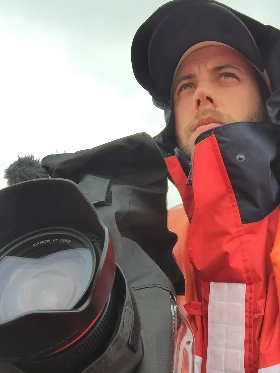The RHIB is pitching at least 120 degrees off flat. Bow skyward, then hull skyward, waves hitting from every angle simultaneously. I'm not operating a camera. I'm surviving, holding on for dear life and trying to keep the camera dry. It might be in a rain cover but one rogue wave and that’s £10K in the drink.