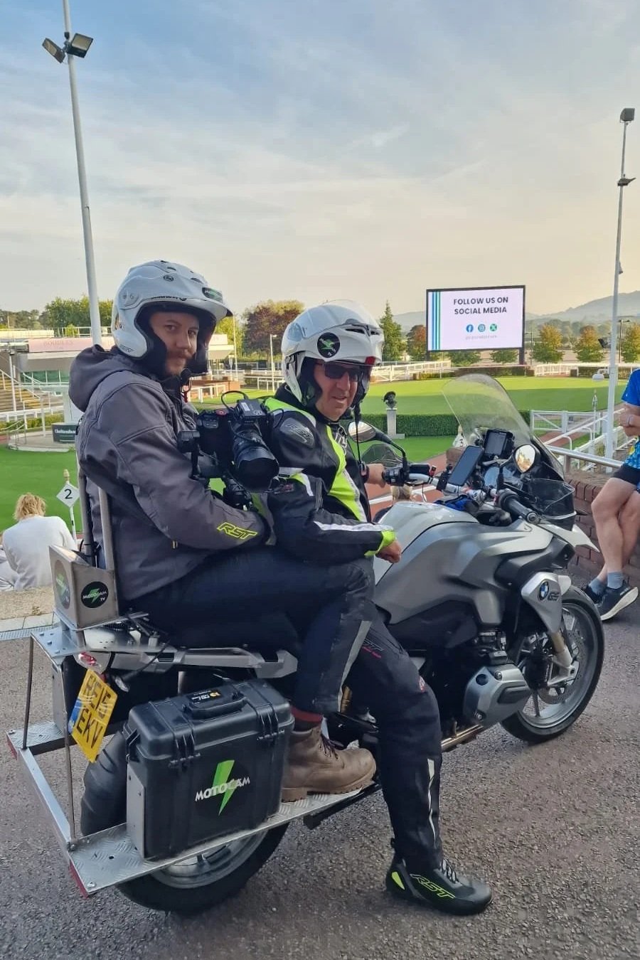 Communication has to be constant. You're telling the pilot what you're getting, whether you're still rolling, and when to move on. They're telling you what's coming up ahead, which direction they're turning, and when the bike is about to bank. That last one matters more than it might seem. When the bike leans into a turn you need to counterbalance with your body to maintain the shot and, critically, to keep the bike's weight distribution manageable for the pilot. If the G-forces in a turn get too much, give up on the shot. Focus on not losing the camera and keeping your balance. The shot isn't worth it.